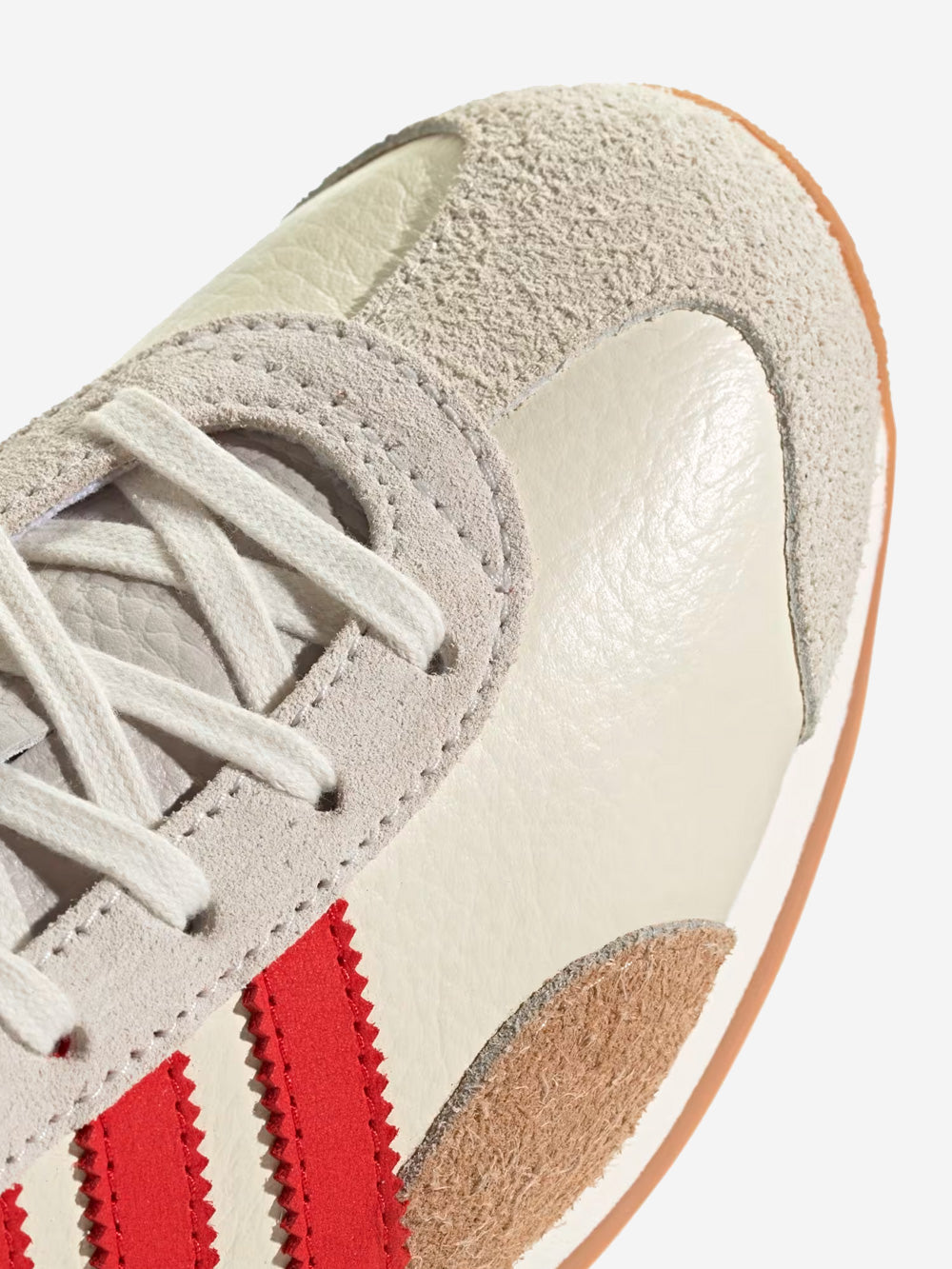 Der adidas Country OG ist ein Laufschuh aus dem Jahr 1972, der heute die Streetwear neu definiert. Das Obermaterial aus Glatt- und Wildleder bietet eine interessante Mischung aus verschiedenen Texturen, die die Silhouette aufwerten.Die erhöhte Dämpfung sorgt für optimalen Halt, während die dünne Gummisohle mit Fischgrätenmuster in jeder Situation zuverlässigen Halt bietet. Die Farbpalette, die neutrale Töne wie Off-White und Grau mit dem Schwung von Rot kombiniert, macht den Country OG zu einem begehrten und vielseitigen Modell.