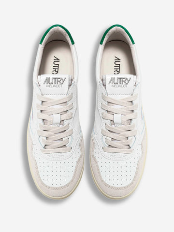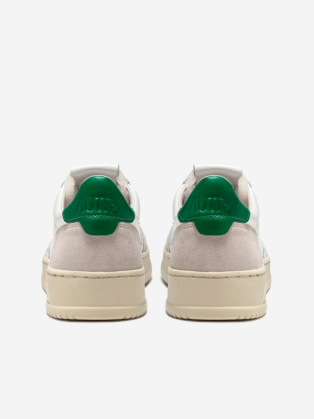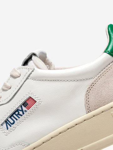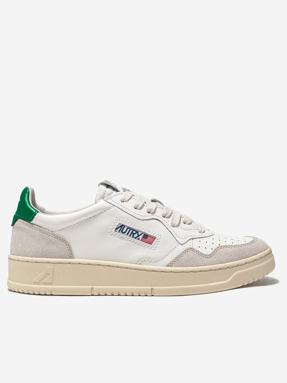 Die Medalist Turnschuhe von Autry wurden mit modernen Proportionen und hochwertigen Materialien neu interpretiert und verleihen den 80er-Jahre-Sneakern einen modernen Touch. Dieser Damenschuh ist aus weichem, weißem Leder gefertigt und mit beigen Wildledereinsätzen versehen, die dem Design ein unverwechselbares Finish verleihen. Die Fersenlasche aus schwarzem Leder ist mit dem Autry-Logo versehen.