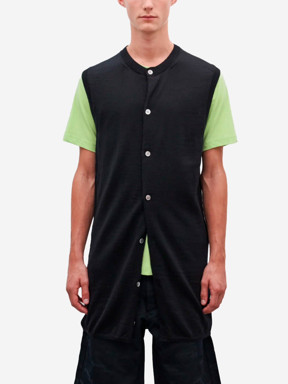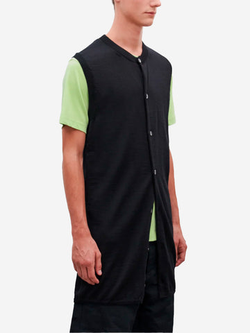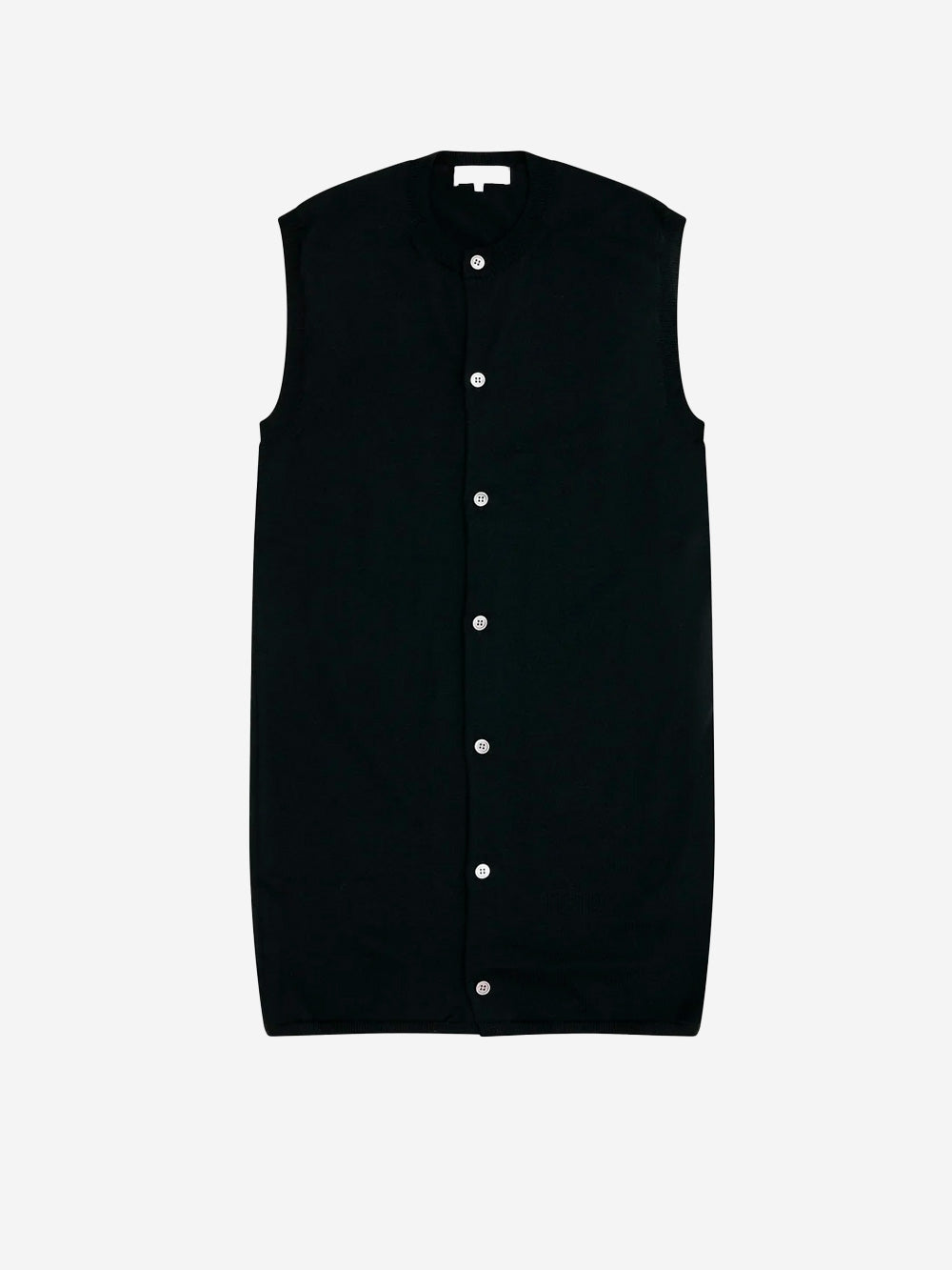Diese ärmellose Strickjacke aus feiner Wolle bietet wohlige Wärme und unvergleichlichen Komfort. Das minimalistische Design mit klaren Linien und gerippten Details eignet sich sowohl für legere als auch für formelle Outfits. Tragen Sie sie über einem Hemd für einen schicken Bürolook oder über einem T-Shirt für einen lässigen Look.
