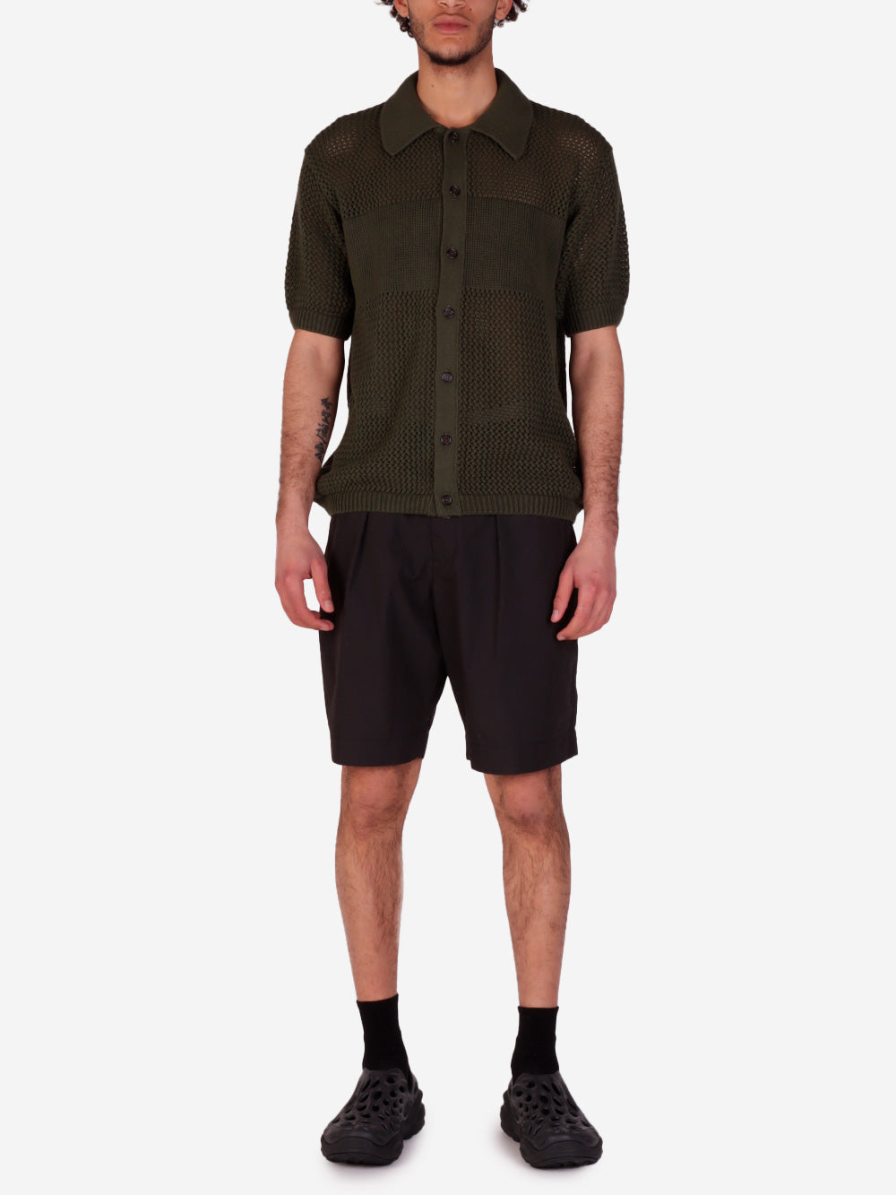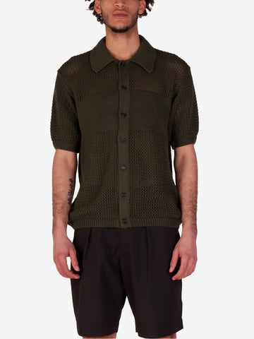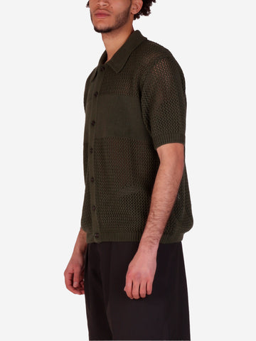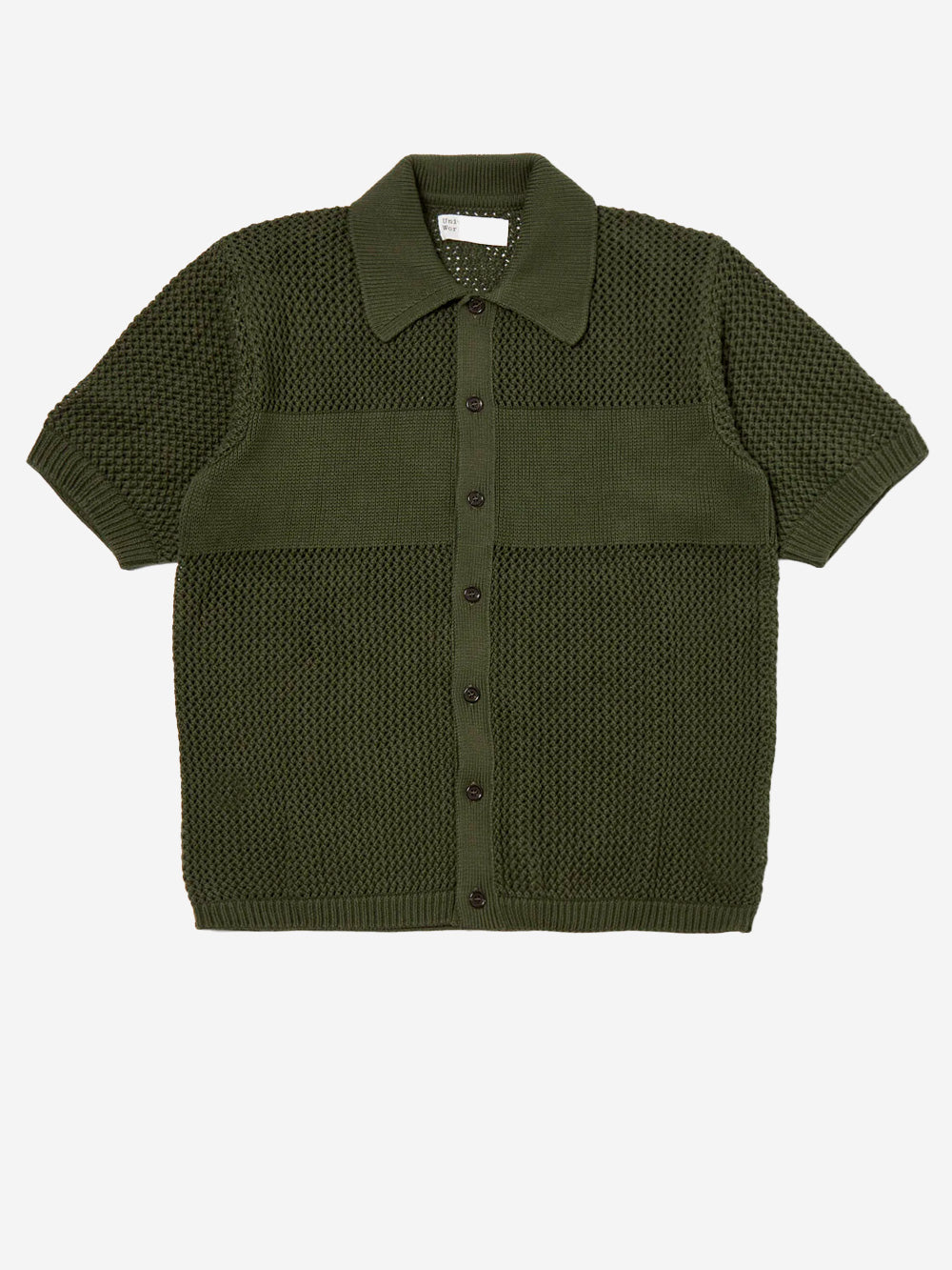 Das perforierte Strickhemd von Universal Works ist das perfekte Herrenkleidungsstück für den Sommer. Dieses Button-Down-Hemd aus Baumwollstrick verfügt über einen klassischen Kragen und einen durchbrochenen Grobstrick für zusätzliche Belüftung in den wärmeren Monaten. Das durchbrochene Hemd ist mit einem einfarbigen Strickband auf der Brust verziert. Sie können es allein oder aufgeknöpft mit einem einfachen T-Shirt oder Tank-Top tragen.