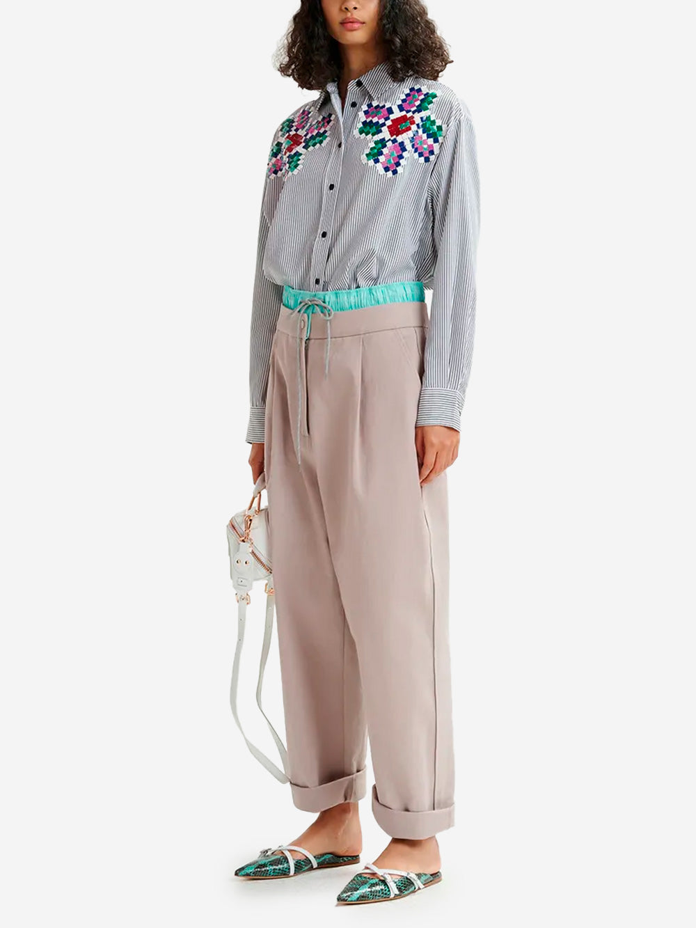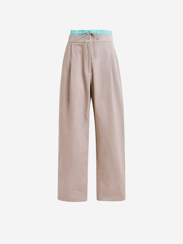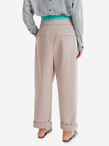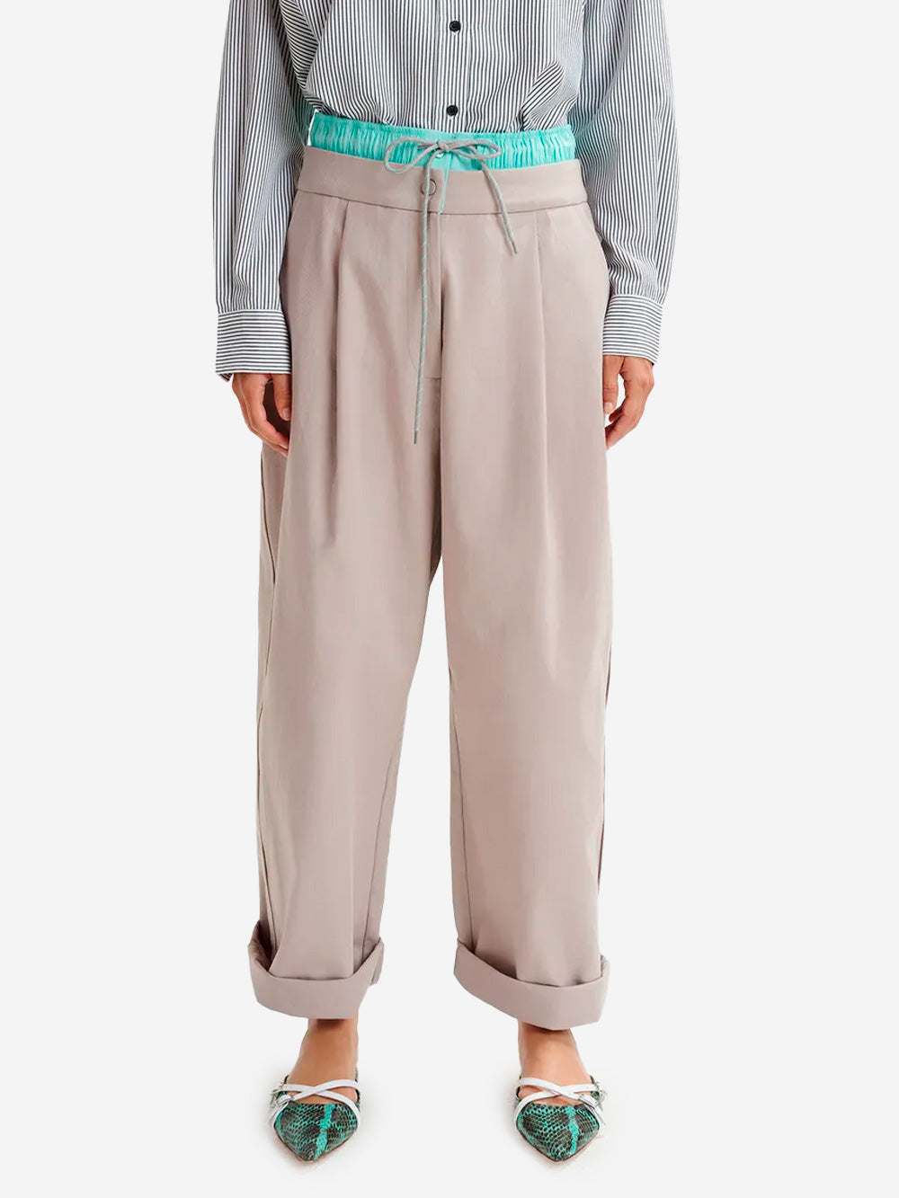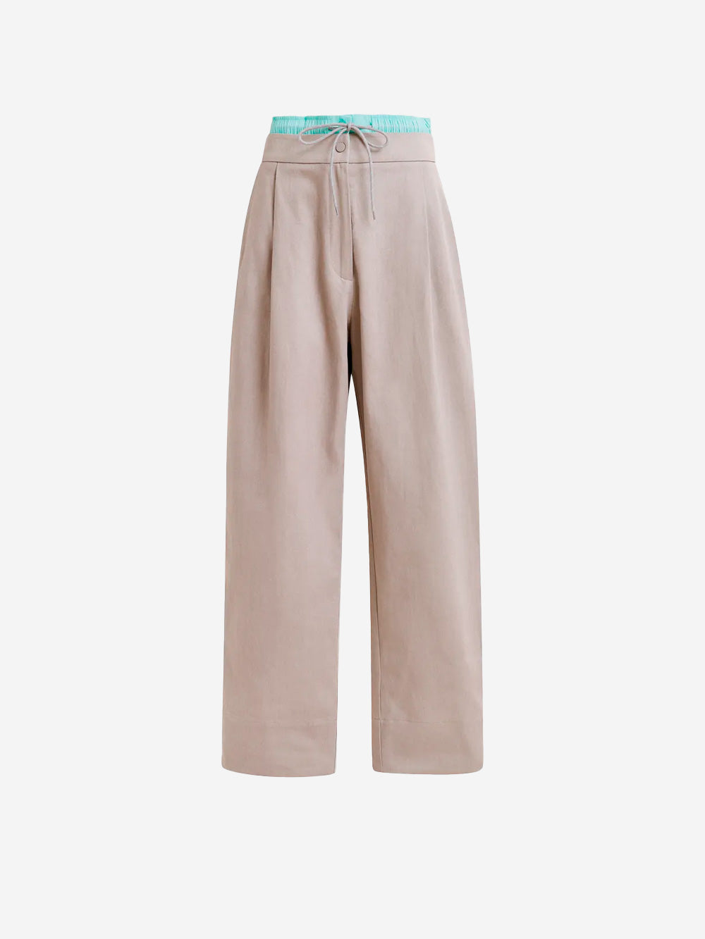 Estos pantalones de algodón orgánico presentan un divertido diseño de cintura doble, rematada con una cintura elástica en contraste y cierre de cordón para un toque inesperado y llamativo. Las perneras cónicas presentan elegantes pliegues delanteros, dos bolsillos ribeteados en la parte trasera, bolsillos delanteros inclinados y un cierre de cremallera en la parte delantera. Perfectos para llevar con zapatillas deportivas para un look urbano o con un par de sabots para un estilo chic y desenfadado.