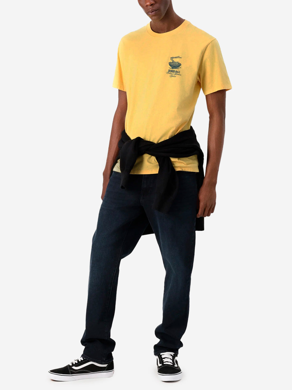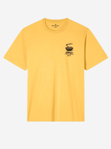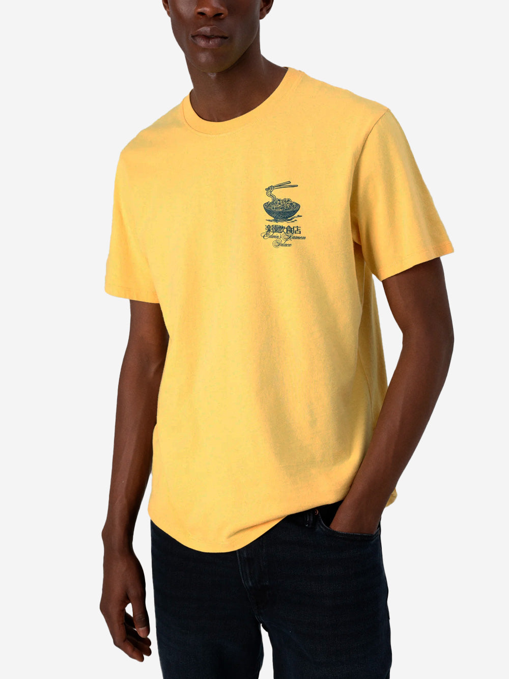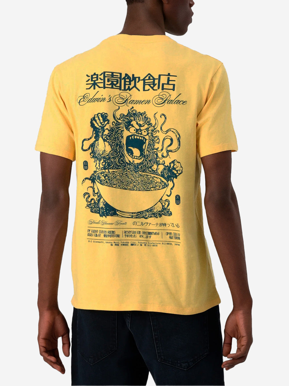 Le t-shirt jaune Ramen Palace d'Edwin est un modèle pour homme qui fusionne le streetwear japonais et les vêtements de loisir. Confectionné en coton de haute qualité, le t-shirt 'Ramen' se distingue par des imprimés sur la poitrine et le dos qui rendent hommage à la culture japonaise. Doté d'une coupe régulière et légèrement décontractée, ce modèle est agrémenté d'un col ras du cou côtelé. Associé au denim japonais d'Edwin, il crée un look à la fois décontracté et sophistiqué.