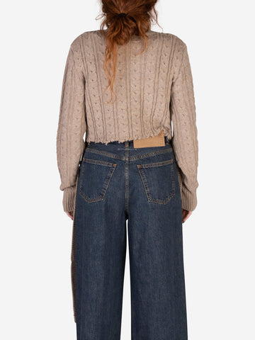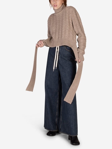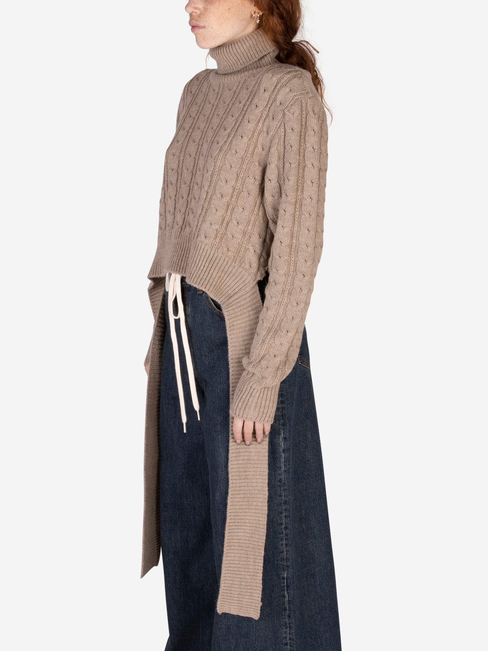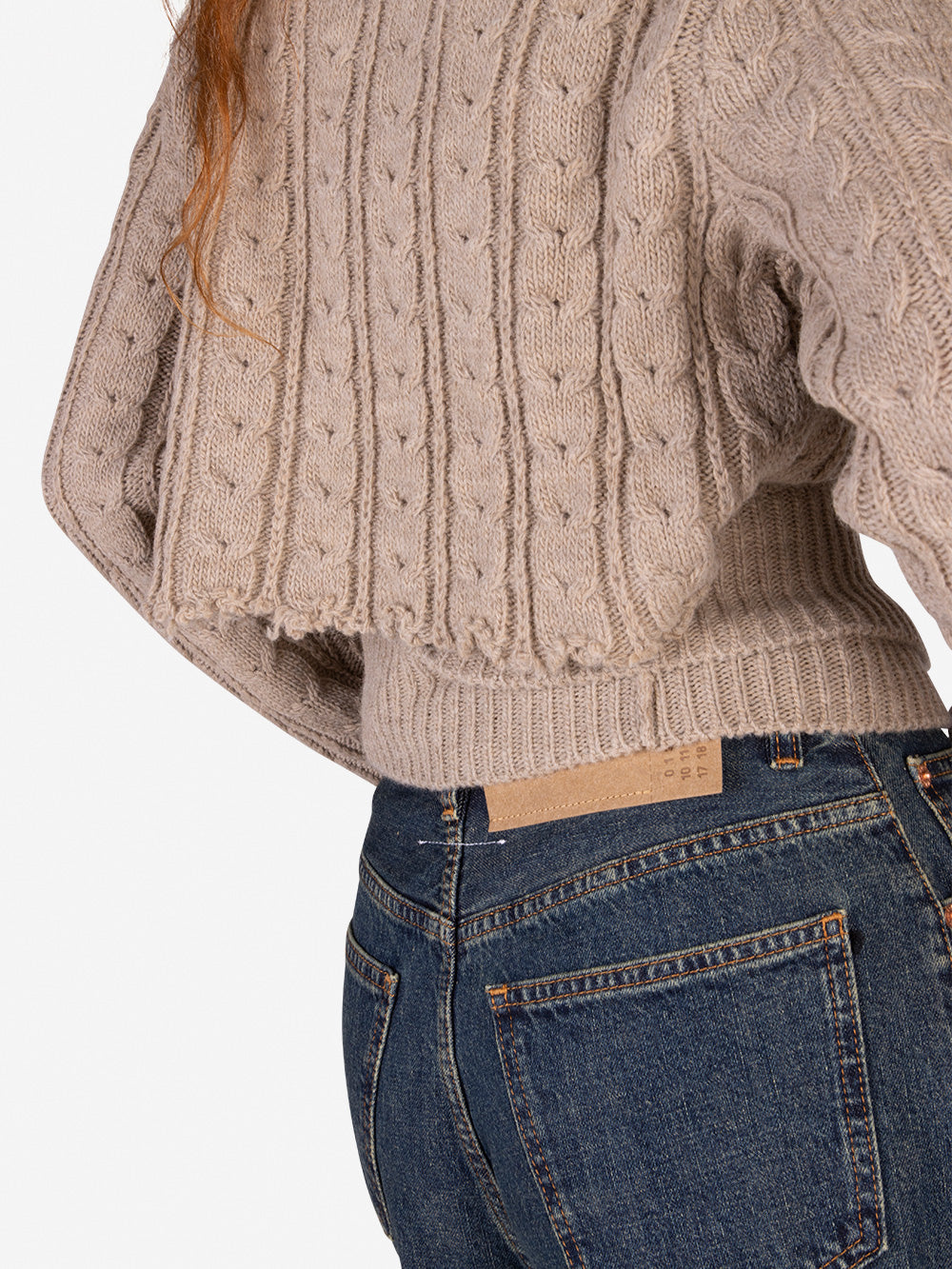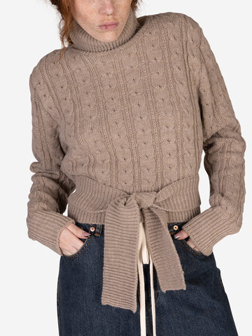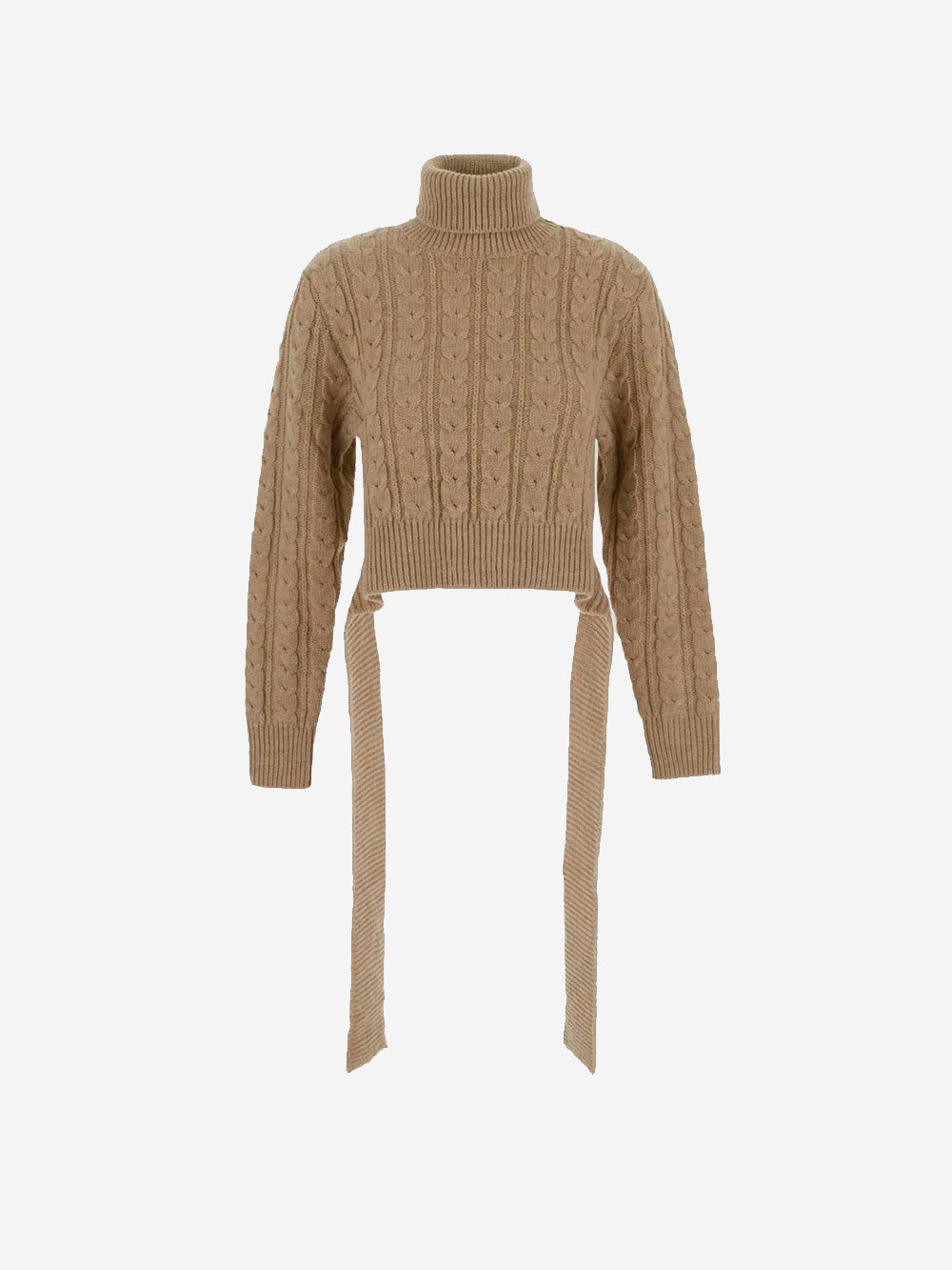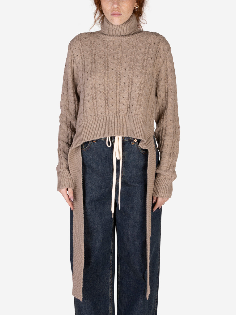 Realizzato in una trama Aran color corda molto vintage, il maglione di MM6 Maison Margiela ispira calore grazie al collo alto ma spicca per il taglio vivo sul retro da cui spuntano due lembi da legare in vita come una cintura.