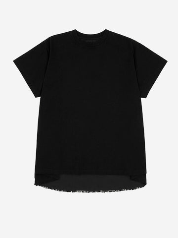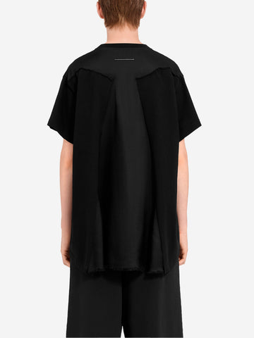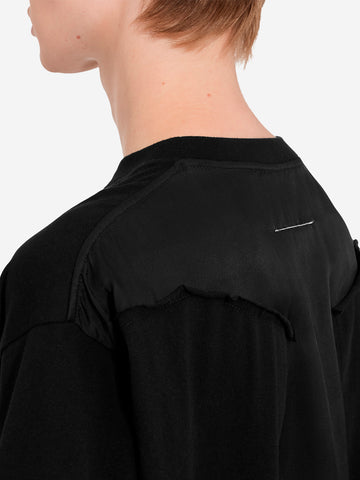 La t-shirt girocollo di MM6 Maison Margiela è una riproduzione fedele della poetica del brand grazie al suo orlo a vivo e all'inaspettato contrasto di materiali sul retro. Realizzata in morbido jersey di cotone, questa t-shirt presenta un classico girocollo e un interessante gioco di textures sul retro. L'iconica white stitch line esprime al massimo l'identità di MM6 Maison Margiela.