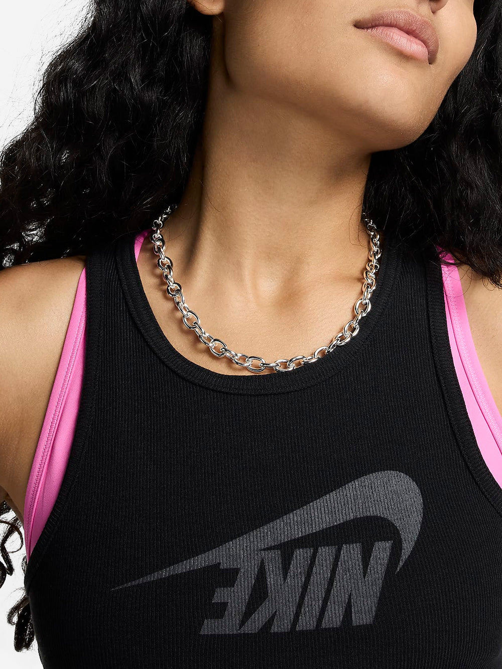 La canottiera a costine di Nike Sportswear è il modello da donna pensato appositamente per le tue sessioni di allenamento. Realizzata in un mix esclusivo di poliestere, rayon ed elastan, questa canotta nera presenta un logo con swoosh capovolto. La lunghezza extra di questa canotta regala un'ampia libertà di movimento, mentre il fit avvolgente esalta la silhouette.
