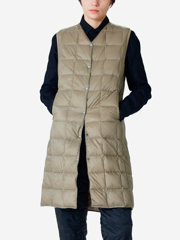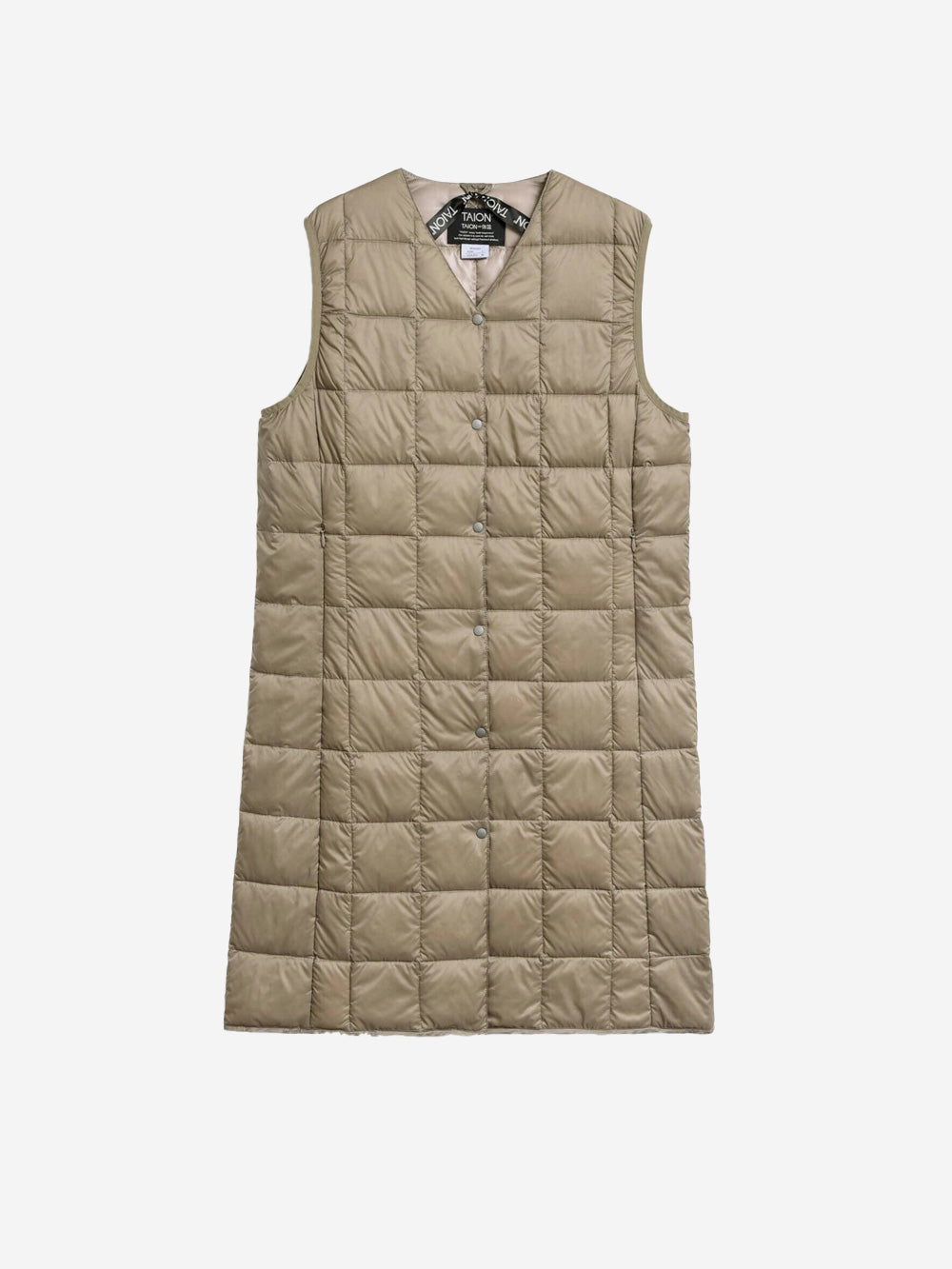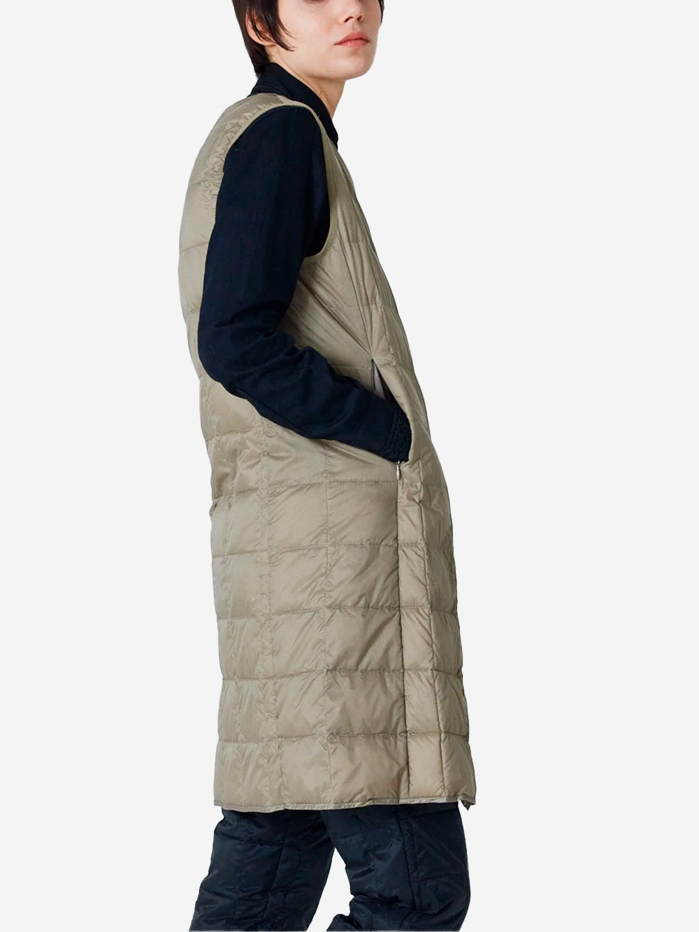 Il gilet lungo di Taion è il capospalla da donna dal design minimal e concettuale, realizzato in nylon trapuntato di alta qualità e imbottito con morbida piuma d'oca. Lo scollo a V e la silhouette allungata creano un'estetica elegante e contemporanea, mentre la piuma d'oca garantisce un isolamento termico ottimale. Perfetto da indossare sopra una camicia, un maglione o un vestito, sia come capospalla principale che sotto un cappotto.