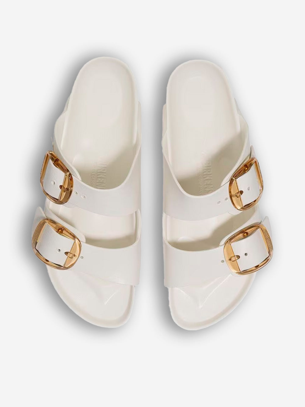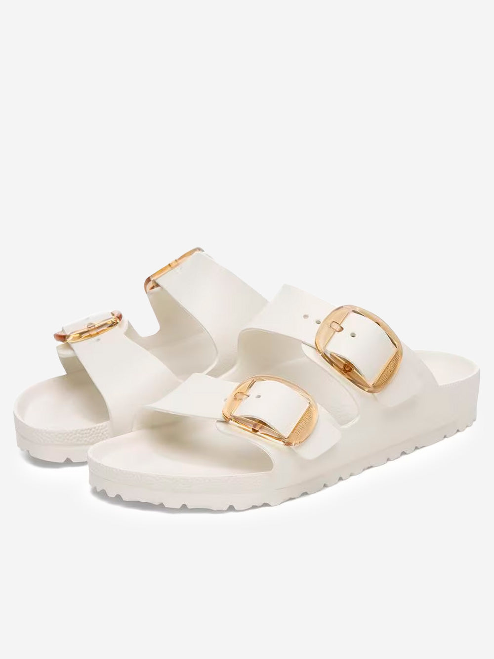 I sandali Birkenstock Arizona Big Buckle EVA sono un classico del footwear estivo. Realizzati con una tomaia in EVA in bianco, gli Arizona Big Buckle presentano una fibbia ad ardiglione grande ed elegante che aggiunge un tocco estroso al design classico. Impermeabili, inodori e incredibilmente leggeri, i sandali Arizona EVA sono semplicemente un must. Il comfort è impeccabile, grazie all'iconico plantare anatomico di Birkenstock. Porta le tue Birkenstock Arizona in città o in spiaggia per scoprire la versatilità di questo sandalo che non conosce limiti.