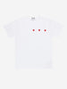 Questa t-shirt di Comme des Garçons Play conserva lo spirito sovversivo di Rei Kawakubo reinterpretandolo con un tocco giocoso. Realizzata in morbido cotone premium, questa t-shirt presenta un design minimal impreziosito da un pattern grafico di tre cuori rossi disposti in maniera orizzontale.