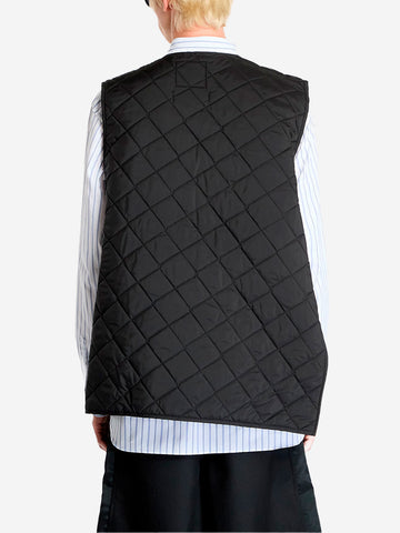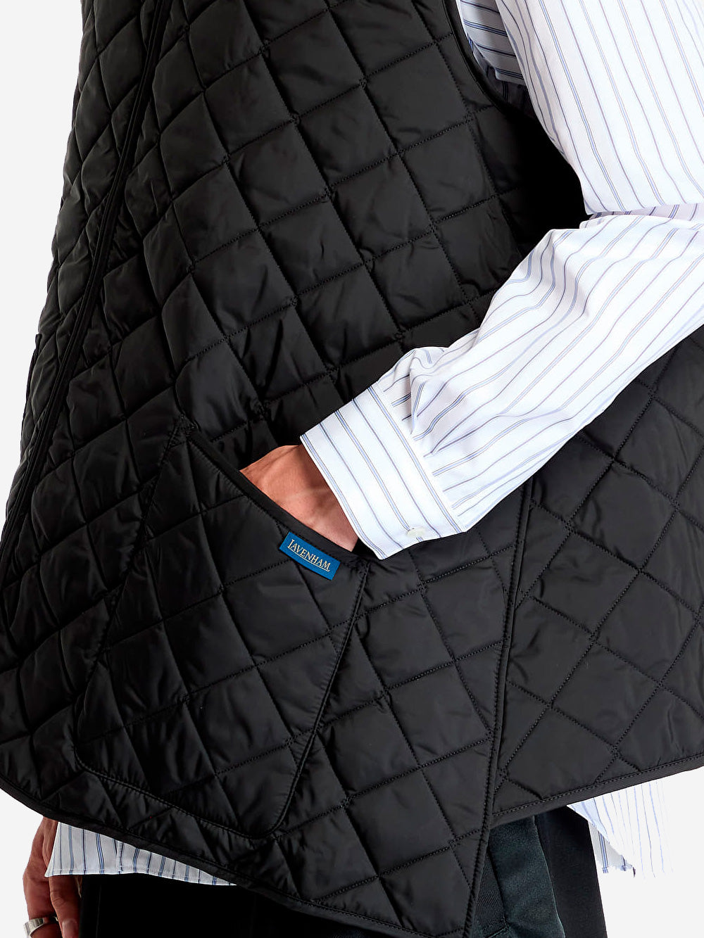 Frutto della collaborazione tra Comme des Garçons Shirt e il rinomato marchio inglese Lavenham, questo gilet rivisita in chiave moderna il classico modello trapuntato. Il taglio diagonale conferisce un tocco di originalità, mentre le due tasche applicate e la fodera assicurano funzionalità e comfort. Realizzato in poliestere di alta qualità e interamente prodotto nel Regno Unito, questo capo è un must-have per gli amanti del design contemporaneo. Indossalo su una camica a righe o un maglione per elevare i basici di tutti i giorni.