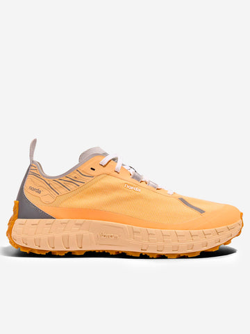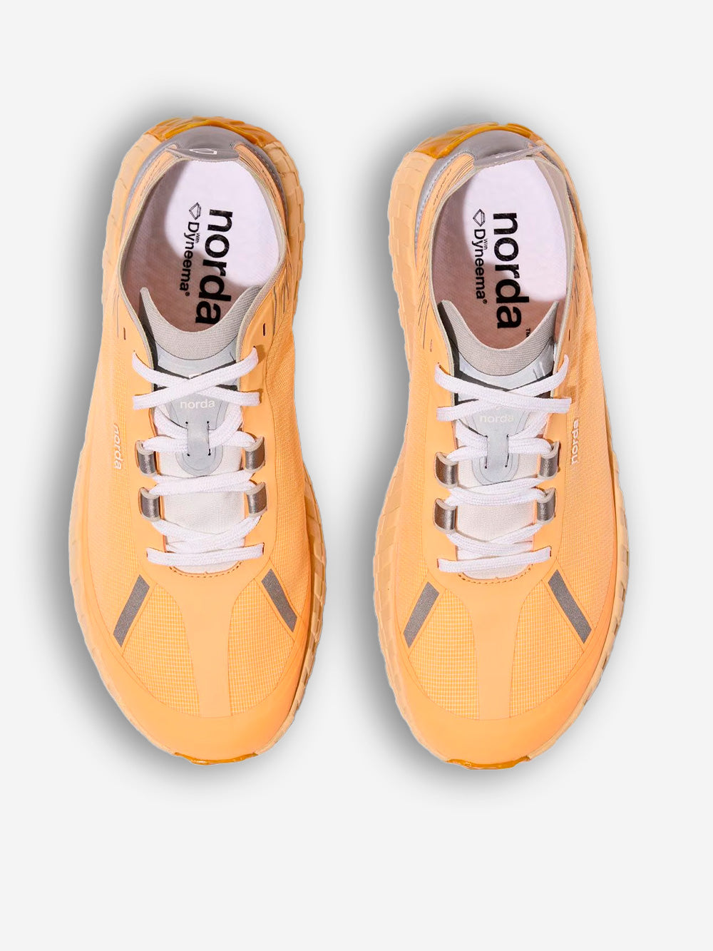Le Norda 001, qui nella colorazione arancione Rhodotus, sono le sneakers da trail dalla tecnologia avanzata e dal design sperimentale. Realizzata con la prima tomaia Bio-Dyneema® senza cuciture al mondo e l'esclusiva intersuola e suola Vibram, la 001 è progettata con i materiali più leggeri e resistenti per un comfort spensierato durante le attività consapevoli.