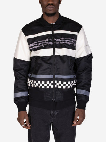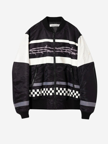 Il bomber di Undercover è l'elevazione dell'outerwear sportivo. La silhouette rilassata con colletto, polsini e orlo a costine si fonde con il motivo a filo spinato in twill, rendendo questo capo iconico e d'effetto. Il contrasto tra il nero e il bianco e le tasche applicate sul braccio trasformano questo bomber in un capo funzionale e allo stesso tempo poetico.